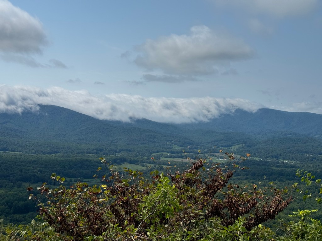 Eventually I came down out of the cloud cover, and stopped at an overlook with clear views. I was able to look back in the direction I’d come from, and see the clouds I’d just driven through sitting on the mountain I’d had such an enjoyable visit with. It was a very sweet moment, and I said a quiet “Thank you” to the mountain and the park and the people who had built it.