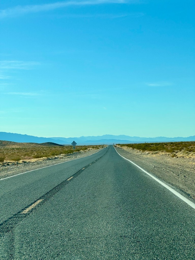 As mentioned, it’s about a 2 hour drive from Las Vegas to Death Valley National Park. I grew up in New Mexico, so going back to the desert feels familiar to me, and the dry air feels like home. Sagebrush makes me smile. My husband grew up in Ohio, so for him it’s a little more like we imagine visiting Mars might be. Here’s a picture of the road, though to be honest it could be pretty much ANY road out there… but I promise it’s the one between Las Vegas and Death Valley.