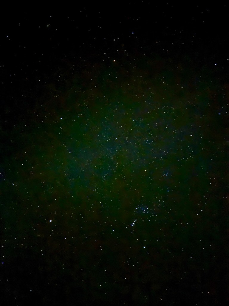 This is a really terrible representation of what was actually out there. But this is what I captured with my regular old iPhone and a 10-second exposure. It looks better if you turn up the brightness on whatever device you’re using right now. Normally, in Ohio, when I can see Orion in the sky he’s just out there all alone. Here, it’s almost easy to miss him because he’s got so many starry friends.